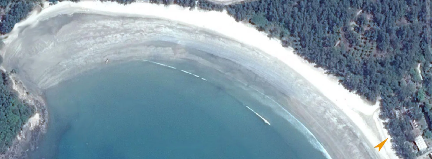 Also at the meeting of the forest and beach, a simple concrete curb frames lounge areas where white cushions rest on the ground, shaded by the forest. There is nothing beyond this but the raked sand, the sea, the distant westward horizon, and the sky.